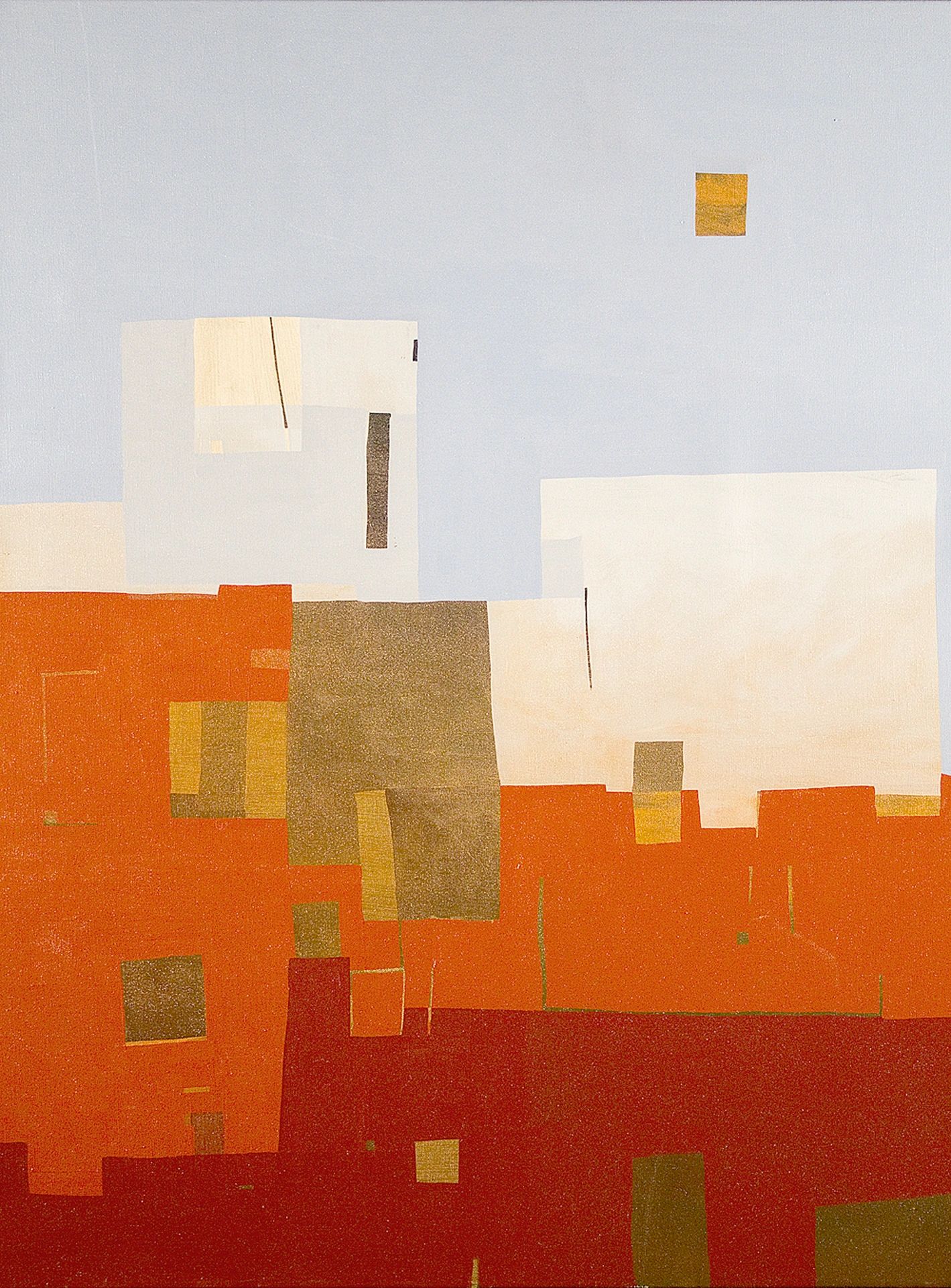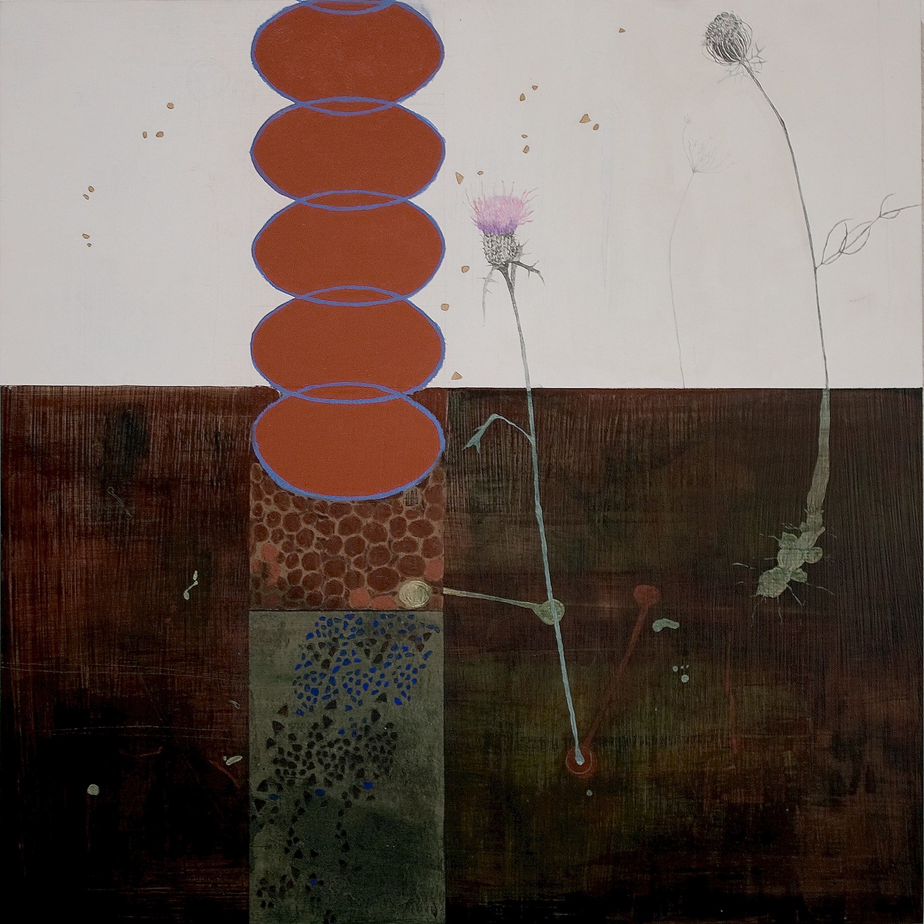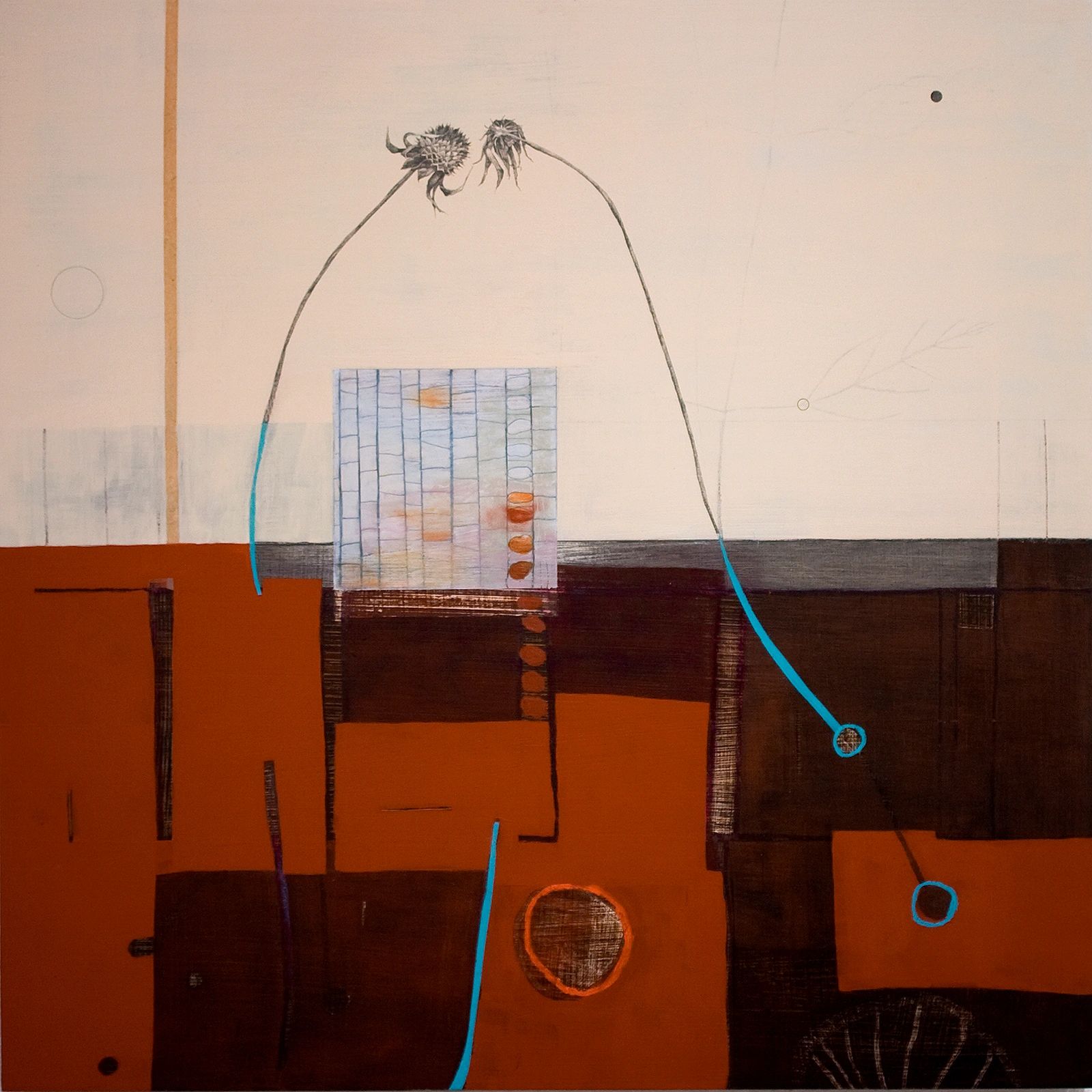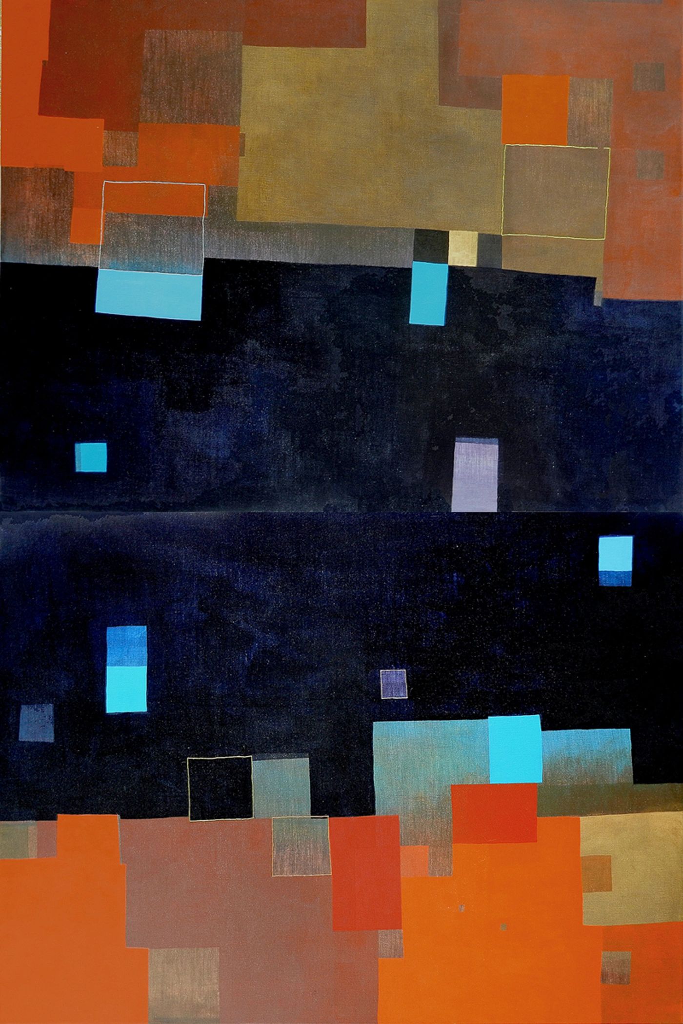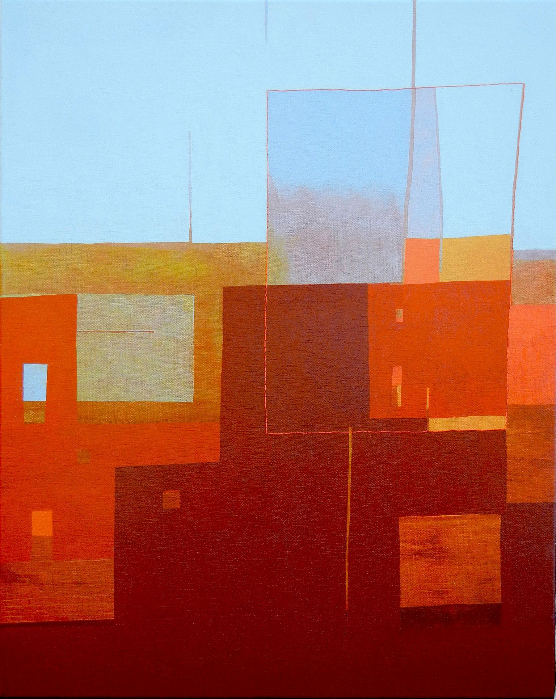 These abstract paintings on linen and panel explore the line between earth and sky through geometries and color. Vertical elements balance the strong horizon. Colors are chosen based on the season or time of day. The distinction between earth and sky creates the tension in the composition.